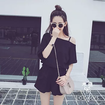 【Lockers 木櫃】寬鬆純色斜邊露肩吊帶上衣+短褲(黑色)