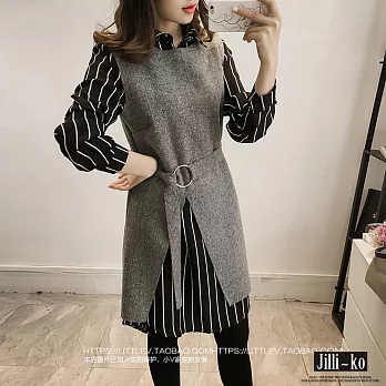 【Jilli~ko】韓版兩件式繫帶襯衫洋-F J5797FREE灰色