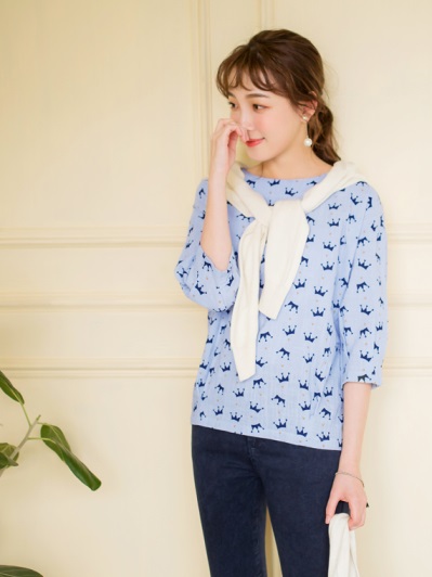 滿版皇冠印花高含棉七分袖上衣