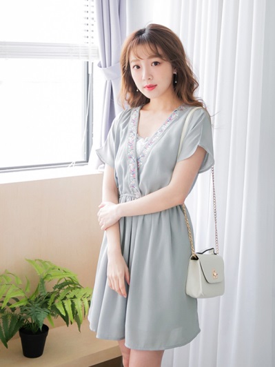 交叉V領綴碎花刺繡縮腰連袖細皺雪紡洋裝.2色