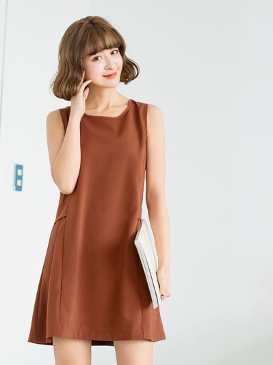 素色側抓皺後釦帶設計傘襬背心洋裝.2色