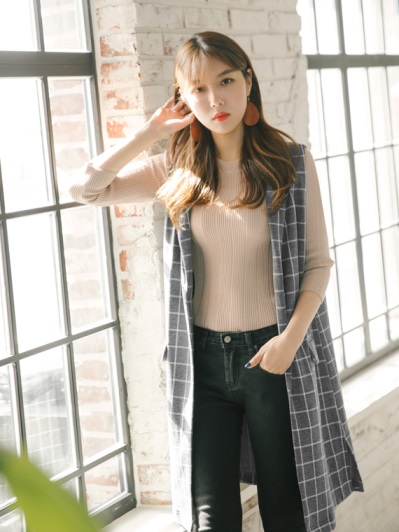 格紋裝飾口袋長版背心外套